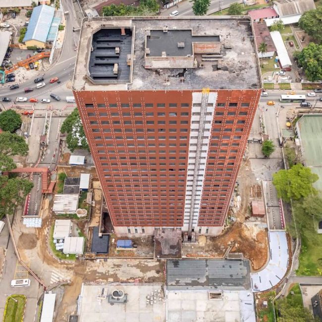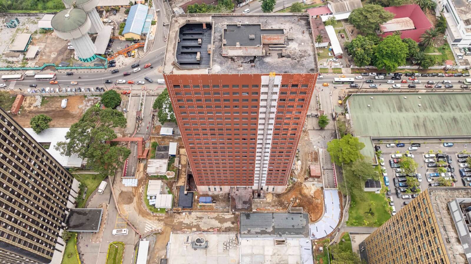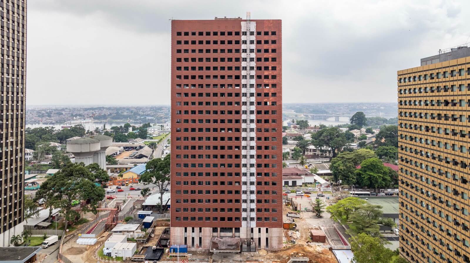 La réhabilitation de la Tour C de la Cité administrative du Plateau s’inscrit dans la continuité du vaste programme entrepris par l’État de Côte d’Ivoire et confié à PFO Construction, après les rénovations réussies des tours A et B. La Tour C est un immeuble de 90 mètres de haut comprenant 24 niveaux, deux sous-sols techniques, trois sous-sols de parking totalisant 389 places ainsi que neuf ascenseurs, pour une surface hors œuvre totale de 27 500 m². Pour permettre les travaux, les occupants ont été temporairement relogés dans les locaux en transformation de l’ancien hôtel Sebroko, ex-siège de l’ONUCI, situé à proximité. Les travaux englobent le désamiantage complet, le remplacement des complexes d’étanchéité, le changement des châssis vitrés de façade, la mise aux normes de sécurité incendie propres aux Immeubles de Grande Hauteur, la rénovation de l’ensemble des installations techniques comprenant l’électricité, la plomberie, la climatisation et le désenfumage, ainsi que le remplacement des ascenseurs. Ils incluent également la réfection des corps d’état secondaires, la remise en état des sous-sols, la mise en lumière du bâtiment et la reprise des extérieurs avec les espaces verts, l’éclairage, le mobilier urbain et la clôture. Les travaux électriques consistent à moderniser et mettre en conformité toutes les installations existantes, intégrer des dispositifs de sécurité incendie adaptés aux IGH, réhabiliter les équipements d’éclairage et optimiser la consommation énergétique globale afin d’améliorer durablement la sécurité et la performance du bâtiment.